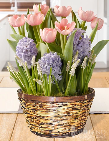 Pink triumph tulips, pale blue hyacinths and fragrant white muscari are sweet, delicate and fragrant! Ships in a wicker basket ready to bloom and grow.