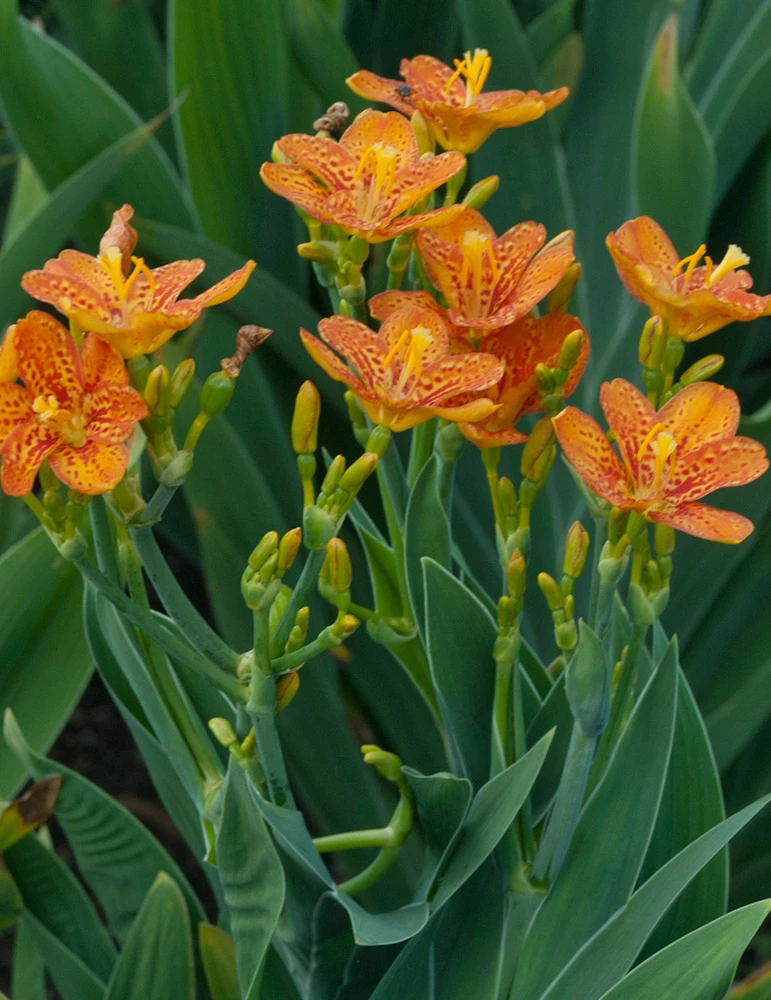 Exquisite late summer blooming perennial with colorful orange blooms and and interesting seed pods in fall. Upright sword like foliage is similar to a bearded iris. This hardy perennial will bloom for several weeks late in summer. In early fall you will notice the the seed pods open to reveal clusters of black seeds that look like blackberries. The showy seeds remain through winter and are unique addition to fresh and dried flower arrangements.