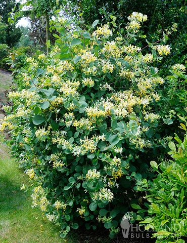 The Halliana Honeysuckle is one of the most widely grown varieties. This variety is very vigorous and bears multiple fragrant, pure white blooms from late Spring through late Summer. The blooms will gradually change to a pale yellow throughout the growing season. The Halliana Honeysuckle will need to grow on a trellis or fence to grow upright but can also be used as a groundcover on slopes or banks.
