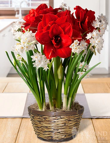 Amaryllis and paperwhite bulbs are among some of the best flowers to get into the holiday spirit! This Holiday Spirit Potted Bulb Garden is the perfect gift for your friends and family to get them in the celebrating spirit. Also makes a lovely centerpiece for your holiday gatherings with friends. Ships ready to grow in a decorative red container, just add water!