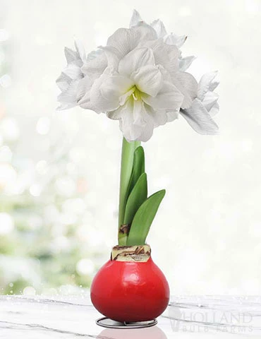 All is Merry and Bright with this beautiful Waxed Amaryllis! The bright white double blooming Amaryllis is dipped in a red wax creating a wonderous combination, sure to make anyone feel merry! All our waxed Amaryllis are hand-dipped in house with our customer wax blend! Place in a bright location in your home and watch it bloom! Waxed Amaryllis will take 6-8 weeks to bloom after arrival.