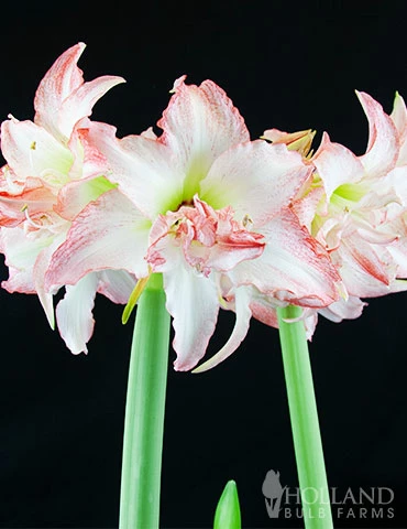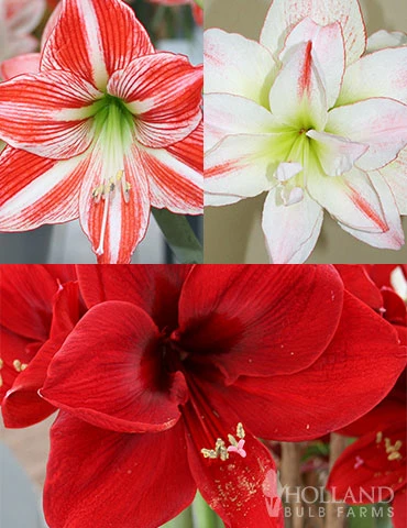 All the peppermint colors in one collection of amaryllis! Striped amaryllis, double flowering amaryllis and classic red amaryllis bulbs are included in this collection. This amaryllis trio can be grown indoors in cold climates, and will bloom within 6-8 weeks of planting. Gardeners in warm climates (hardiness zone 9 and above) can plant amaryllis bulbs in the ground outside!