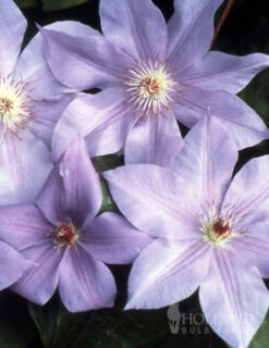 Ramona Clematis has lavender blue blooms with red stamens through July, August and September. This clematis features pale blue flowers that can be up to 7″ in diameter which really make for a nice show!