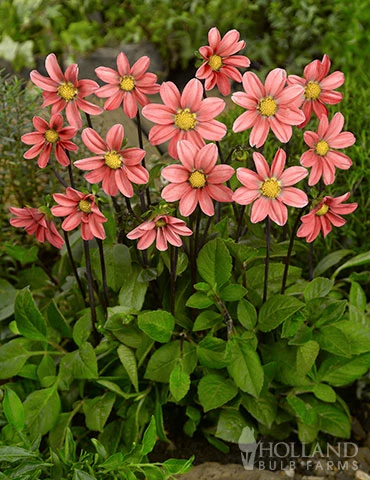 Although the Topmix Salmon Dahlia is a dwarf variety, it is sure to make a large impact to your garden bed or container. The compact growing habit is perfect for the front border in your garden. The single blooms are a salmon/pink color and will bloom all Summer into Fall.