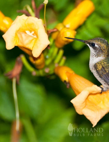 Yellow trumpet shaped blooms adorn this vigorous climbing vine late summer to autumn. Best when planted on a trellis or fence, and great for attracting hummingbirds! Be patient with this fast grower, it may take warm spring temperatures for the vine to break dormancy. Once the vine breaks dormancy it will be very happy to cover your fence, trellis or other structure.